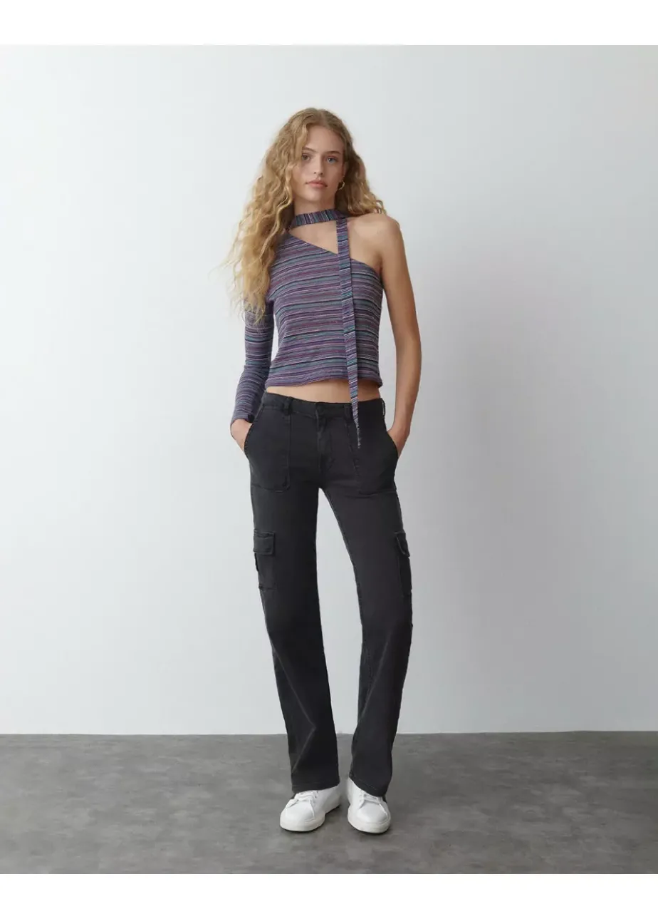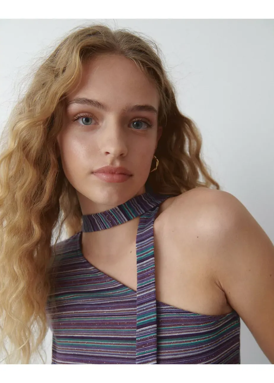 Camiseta Asimetrica De Rayas Con Una Manga Larga Y Detalle De Choker A Conjunto.Composicion:
