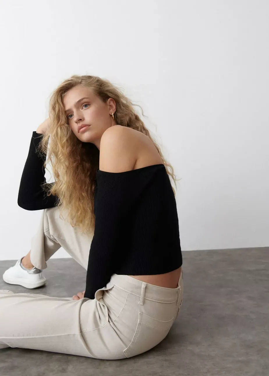 Jersey De Manga Larga, Escote De Banera Y Cuello Tipo Halter Con Tiras Atadas Al Cuello.Composicion: